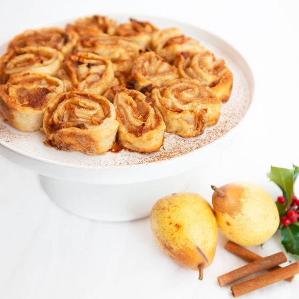 5. Dispor as fatias de pera na massa e enrolar, apertando muito bem mas sem rasgar.